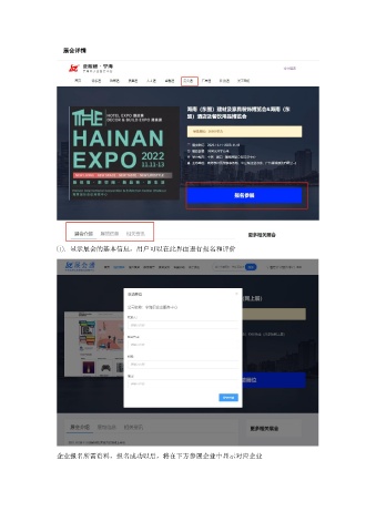 展会详情 1 .显示展会的基本信息,用户可以在此界面进行报名和评价 企业报名所需资料,报名成功以后,将在下方参展企业中显示对应企业